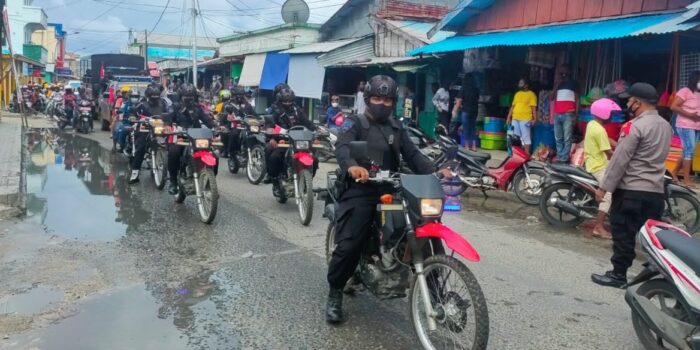 Dobo, Tribun-Aru.com: Menjelang pergantian Tahun Baru 2021, Personel Brimob Polda Maluku Kompi 2 Batalyon C Pelopor melaksanakan Patroli skala besar di seputaran Kota Dobo Kabupaten Kepulauan Aru, Kamis (31/12/2020).