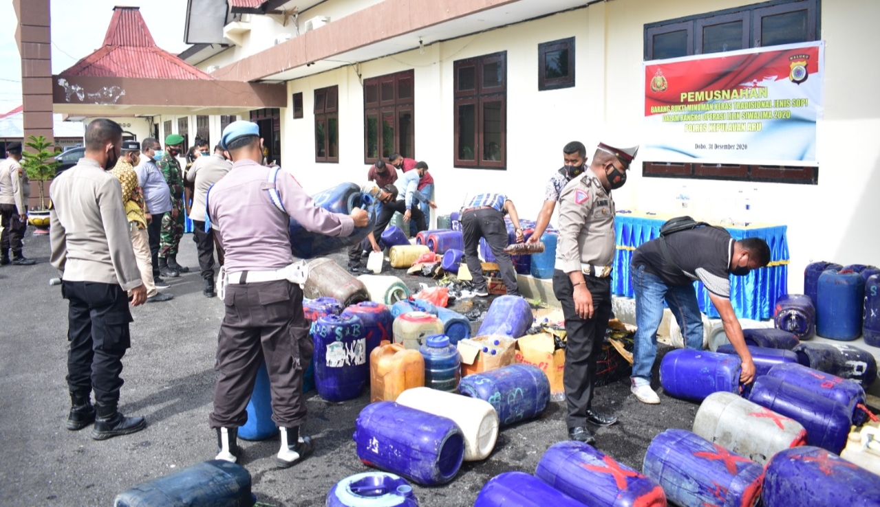 Ribuan liter miras tersebut merupakan hasil sitahan jajaran Polres Kepulauan Aru di sejumlah lokasi berbeda dalam operasi lilin Siwalima tahun 2020.