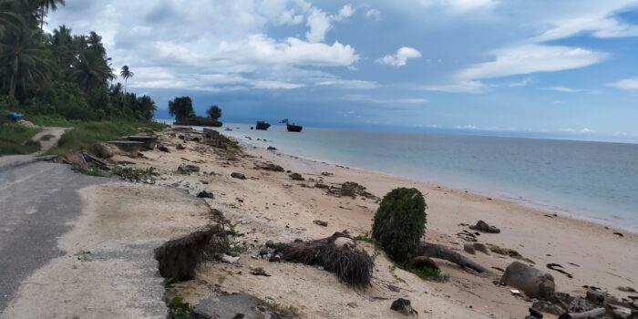Namun sangat miris, kawasan dengan hamparan pasir putih dan dihiasi talud yang kokoh dan jalan hotmix kini hanya jadi cemohan warga kerena tinggal puing-puing, bahkan pada beberapa titik permukaan jalan aspal pun sudah tidak nampak akibat terkikis abrasi.