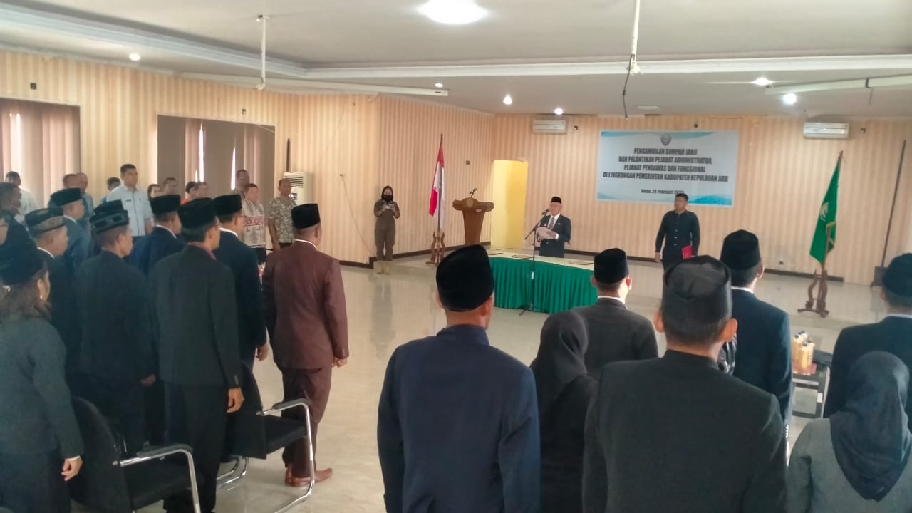 Dobo, BeritaJar.com: Bupati Kepulauan Aru dr. Johan Gonga mengambil sumpah/janji dan pelantikan dalam jabatan administrator, pengawas, kepala puskesmas dan kepala sekolah di lingkungan pemerintah Kabupaten Kepulauan Aru.