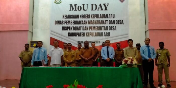 Penandatanganan yang berlangsung, Senin (06/03/2023) di gedung Sitakena tersebut dilakukan Kepala Kejari Kepulauan Aru Parada Situmorang bersama pemerintah desa di 117 desa itu, disaksikan Wakil Bupati Kepulauan Aru Muin Sogalrey, Kepala KPPN Tual Rosyid, Kepala Inspektorat Aru Calistus Heatubun dan Kadis Pemberdayaan Masyarakat dan Desa Yoseph Lakesjanan.