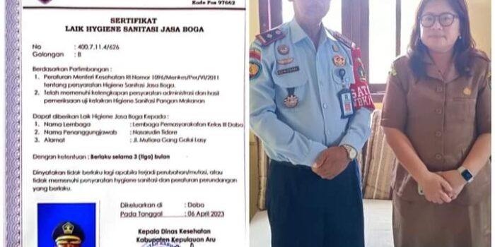 Dobo, BeritaJar.com: Lembaga Pemasyarakatan Kelas III Dobo, Kanwil Kemenkumham Maluku, mendapatkan Sertifikat Dapur Laik Higiene dari Dinas Kesehatan Kabupaten Kepulauan Aru.