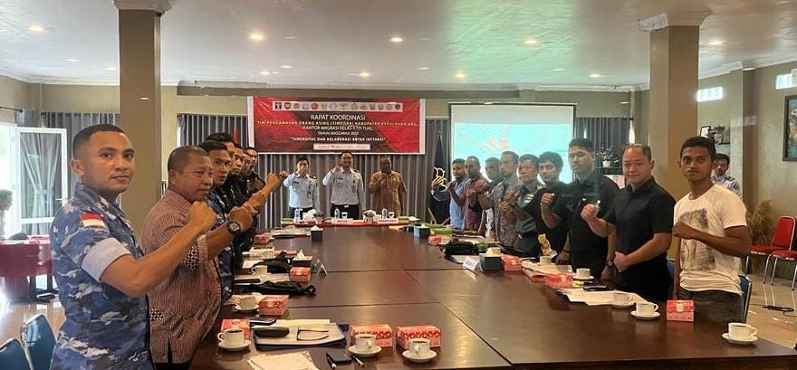 Dobo, BeritaJar.com: Kantor Imigrasi Kelas II TPI Tual menggelar Rapat Koordinasi (Rakor) bersama Tim pengawasan Orang Asing (TIMPORA) Kabupaten Kepulauan Aru, Kamis (13/7/2023) di Exclusive Meeting Room Gospel Caffe dengan tema “Sinergitas dan Kolaborasi antar Instansi”.