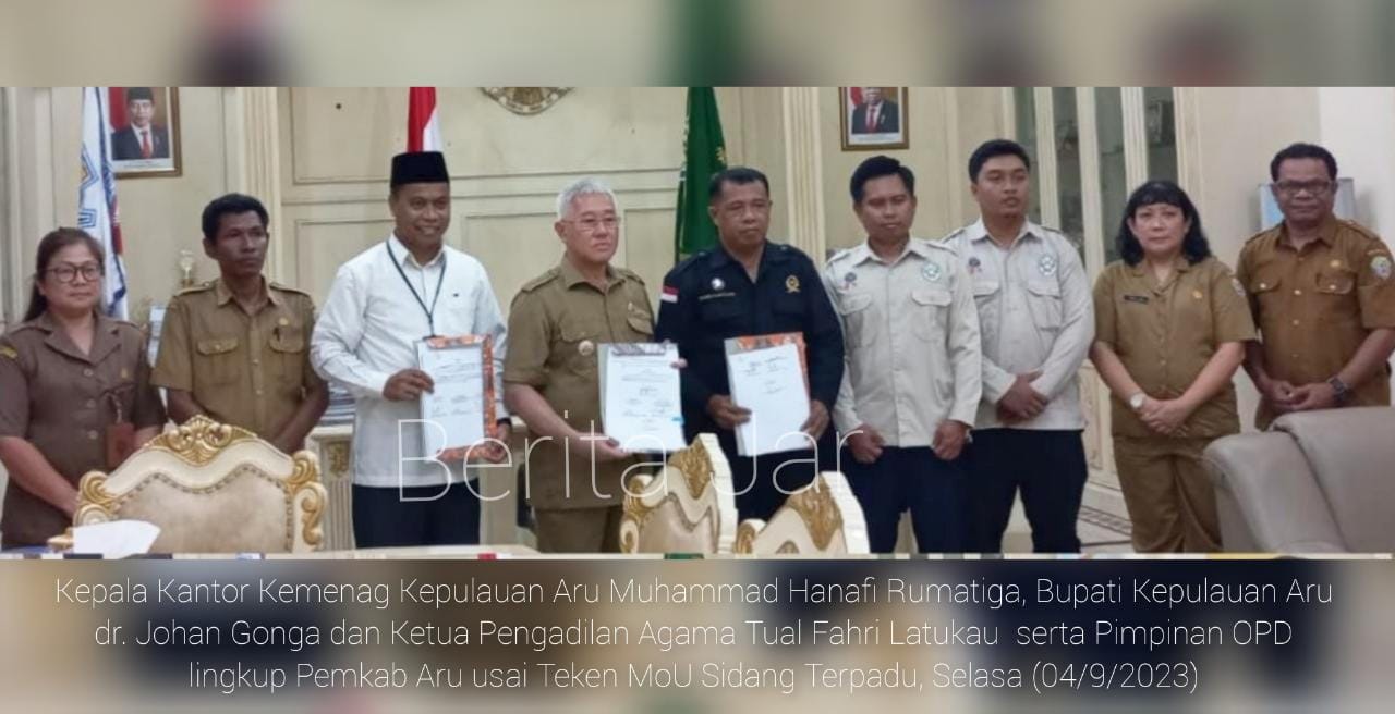 Dobo, BeritaJar.com: Kementerian Agama Kepulauan Aru, Pengadilan Agama Tual dan Pemerintah Kabupaten (Pemkab) Kepulauan Aru melaksanakan Penandatanganan Nota Kesepakatan Kerjasama (MoU) terkait dengan Sidang Terpadu, Senin (04/9/2023).