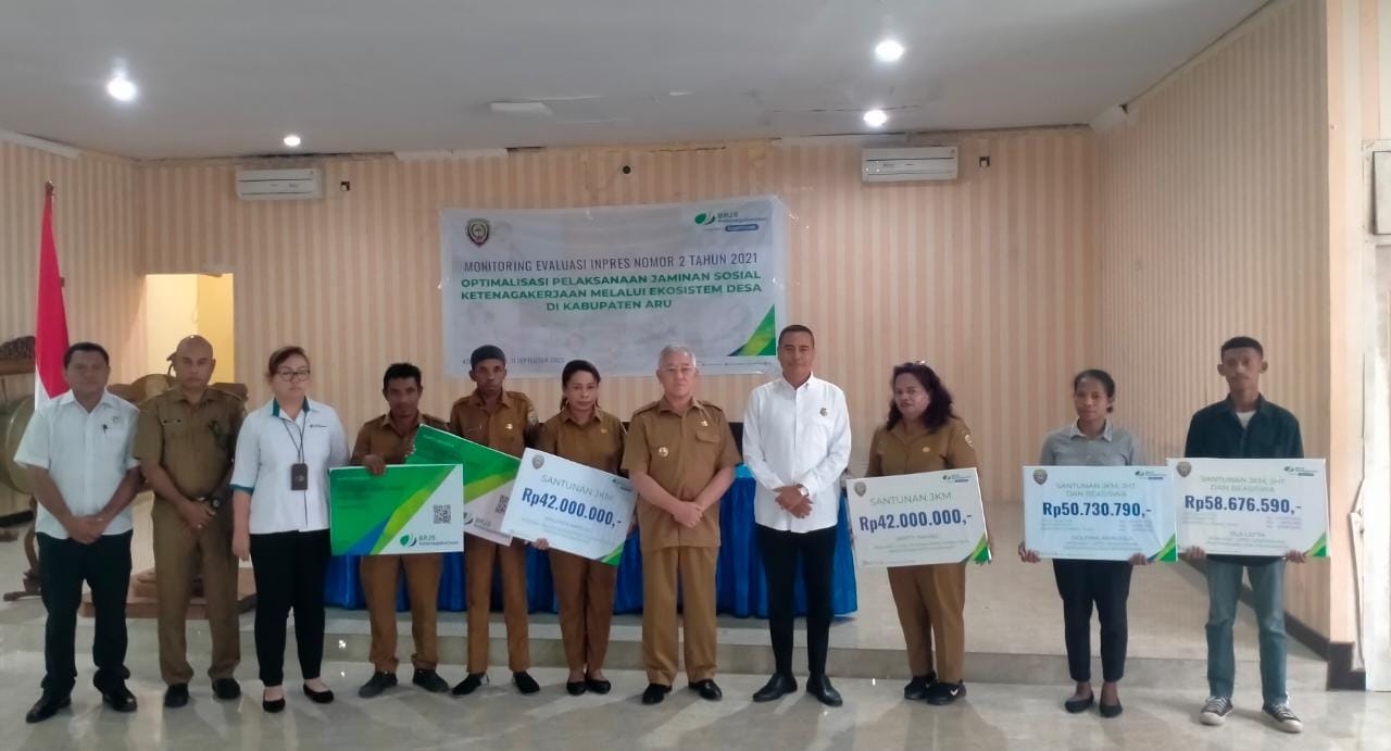 Penyerahan santunan tersebut didampingi Kepala BPJS Ketenagakerjaan Cabang Tual, Maluku Tenggara dan Kepulauan Aru, Elizabeth Lisya Wiharja pada kegiatan Monitoring Evaluasi (Monev) Impres Nomor 2 tahun 2021 tentang optimalisasi pelaksanaan jaminan sosial ketenagakerjaan melalui ekosistem desa di Kabupaten Kepulauan Aru, Senin (11/9/2023) di lantai II BPKAD Kepulauan Aru.