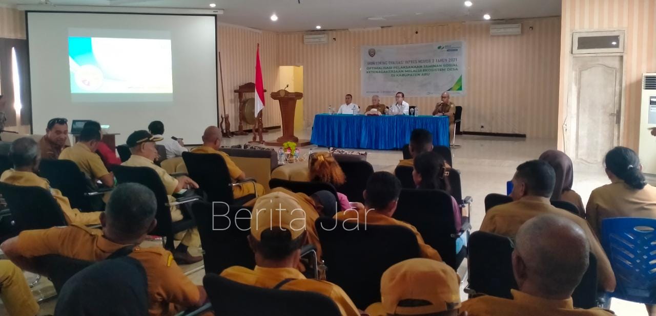 Dobo, BeritaJar.com: BPJS Ketenagakerjaan wilayah Tual, Malra dan Aru mengandeng Pemerintah Kabupaten (Pemkab) Kepulauan Aru menggelar Monitoring Evaluasi (Monev) Impres Nomor 2 tahun 2021 tentang optimalisasi pelaksanaan jaminan sosial ketenagakerjaan melalui ekosistem desa di Kabupaten Kepulauan Aru.