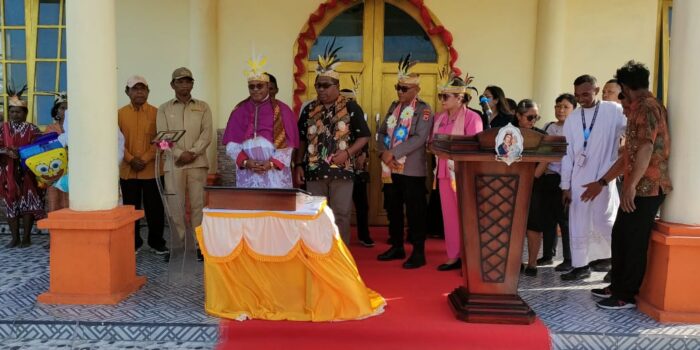 Dobo, BeritaJar.com: Wakil Bupati Kepulauan Aru Muin Sogalrey menghadiri peresmian Gereja Katolik Bunda Hati Kudus di desa Bemun di kecamatan Aru Selatan, Jumat (22/9/2023).