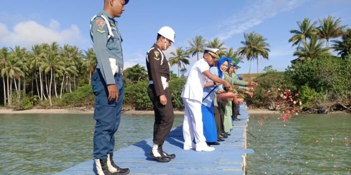 Tampak Komandan Lanal Aru, Letkol Laut (P) Prasetiyo Agus Hariadi, SE., M.Tr. Opsla dan istrinya ikut dalam kegiatan tabur bunga tersebut yang berlangsung, Rabu (04/10/2023).