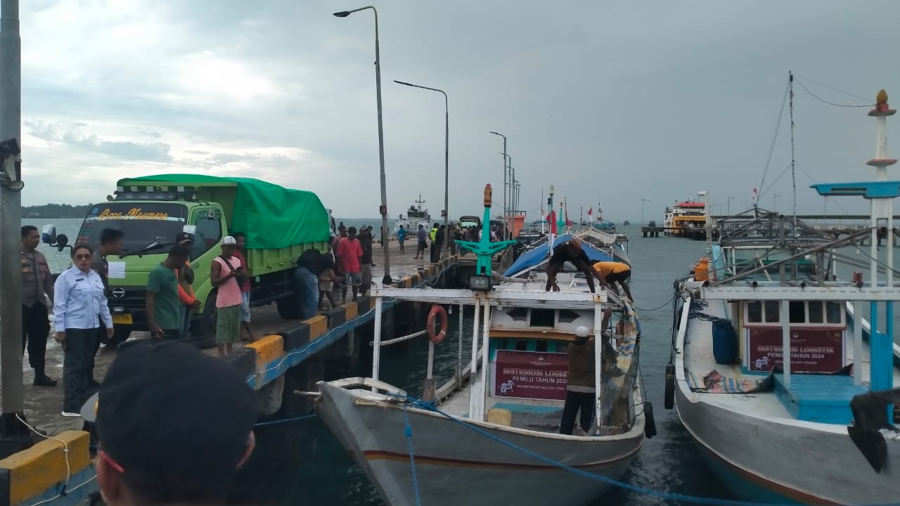 Tampak, sejumlah personel Polri menjaga ketat kapal motor pengangkut logistik pemilu. Pengamanan juga lebih ekstra untuk surat suara dan kotak suara dibungkus dengan plastik.