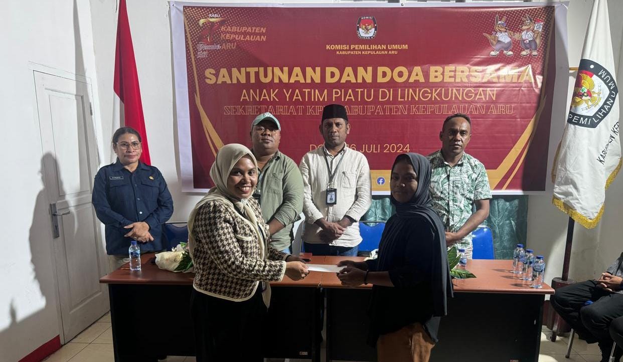 Dobo, BeritaJar.com: Komisi Pemilihan Umum (KPU) Kepulauan Aru memberikan santunan dan doa bersama anak yatim piatu di lingkungan sekretariat KPU setempat, Selasa (16/7/2024).