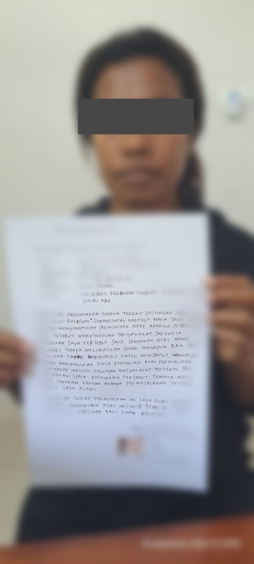 Dirinya juga menyampaikan, terhadap pemilik akun facebook tersebut, pihak kepolisian telah melakukan Interview dalam rangka klarifikasi/penyelidikan pada hari Jumat Tgl 06 Sept 2024 pukul 02.15 WIT.