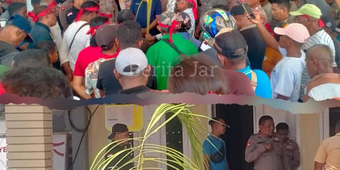 Dobo, BeritaJar.com: Solidaritas Pemuda Kecamatan Aru Selatan Timur memasang sasi adat di Kantor Badan Pengawas Pemilu (Bawaslu) dan kantor Bupati Kabupaten Kepulauan Aru, Jumat (6/9/2024).