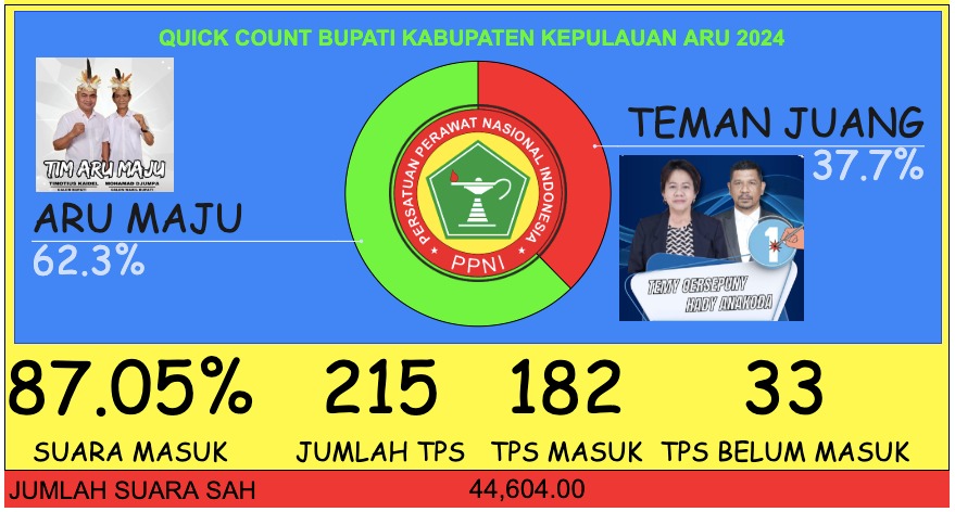 Ketua PPNI Kepulauan Aru, Sheva Madubun menyampaikan, berdasarkan hasil hitung cepat Versi PPNI Kabupaten Kepulauan Aru, Paslon Kaidel dan Djumpa meraih 62,03 persen suara, sementara paslon Themi-Hady memperoleh 37,07 persen suara.