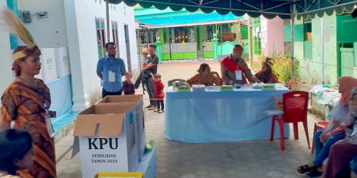 Dobo, BeritaJar.com: Petugas Kelompok Penyelenggara Pemungutan Suara (KPPS) di Tempat Pemungutan Suara (TPS) 01, Kelurahan Siwalima Kecamatan Pulau-Pulau Aru tampil unik saat proses pencoblosan.