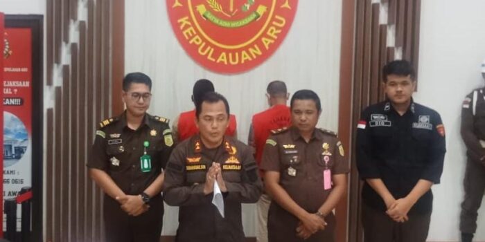 “Hari ini Kejaksaan Negeri Kepulauan Aru telah menetapkan 2 Tersangka baru Tindak Pidana Korupsi Dugaan Tindak Pidana Korupsi Penyalahgunaan/Penyimpangan dalam Pembangunan Gedung Layanan Perpustakaan yang bersumber dari APBD Kabupaten Kepulauan Aru Tahun Anggaran 2022,” ungkap Siagian yang didampingi Kasi Pidsus, Sudarmono tuhulele, SH. MH dan Kasi Intel, Faisal Adhyaksa, SH saat konferensi pers di kantor Kejari Kepulauan Aru.