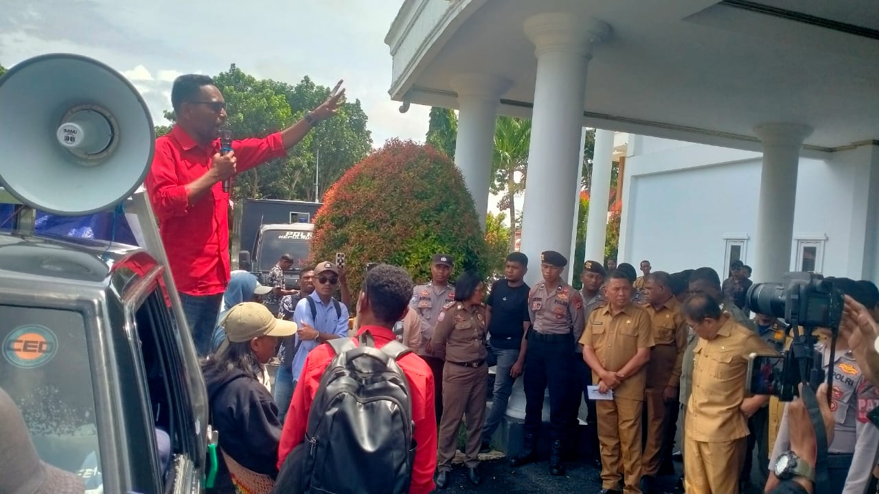 Usai di kantor bupati, masa aksi kemudian melanjutkan ke kejaksaan Negeri Kepulauan Aru.