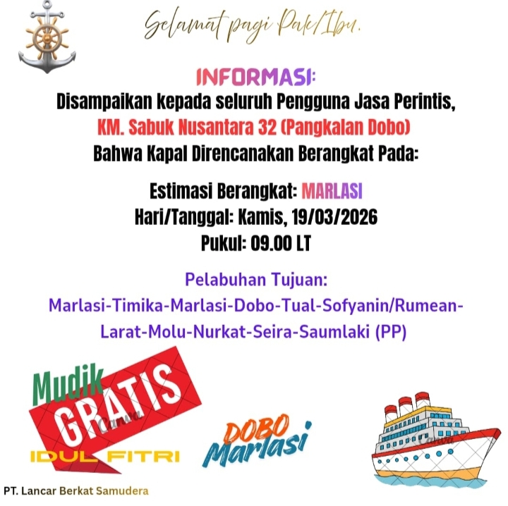 Untuk mendukung mobilitas warga ke wilayah Utara, kapal Sabuk Nusantara 32 dijadwalkan berangkat menuju Pelabuhan Marlasi pada Kamis (19/3) pagi.